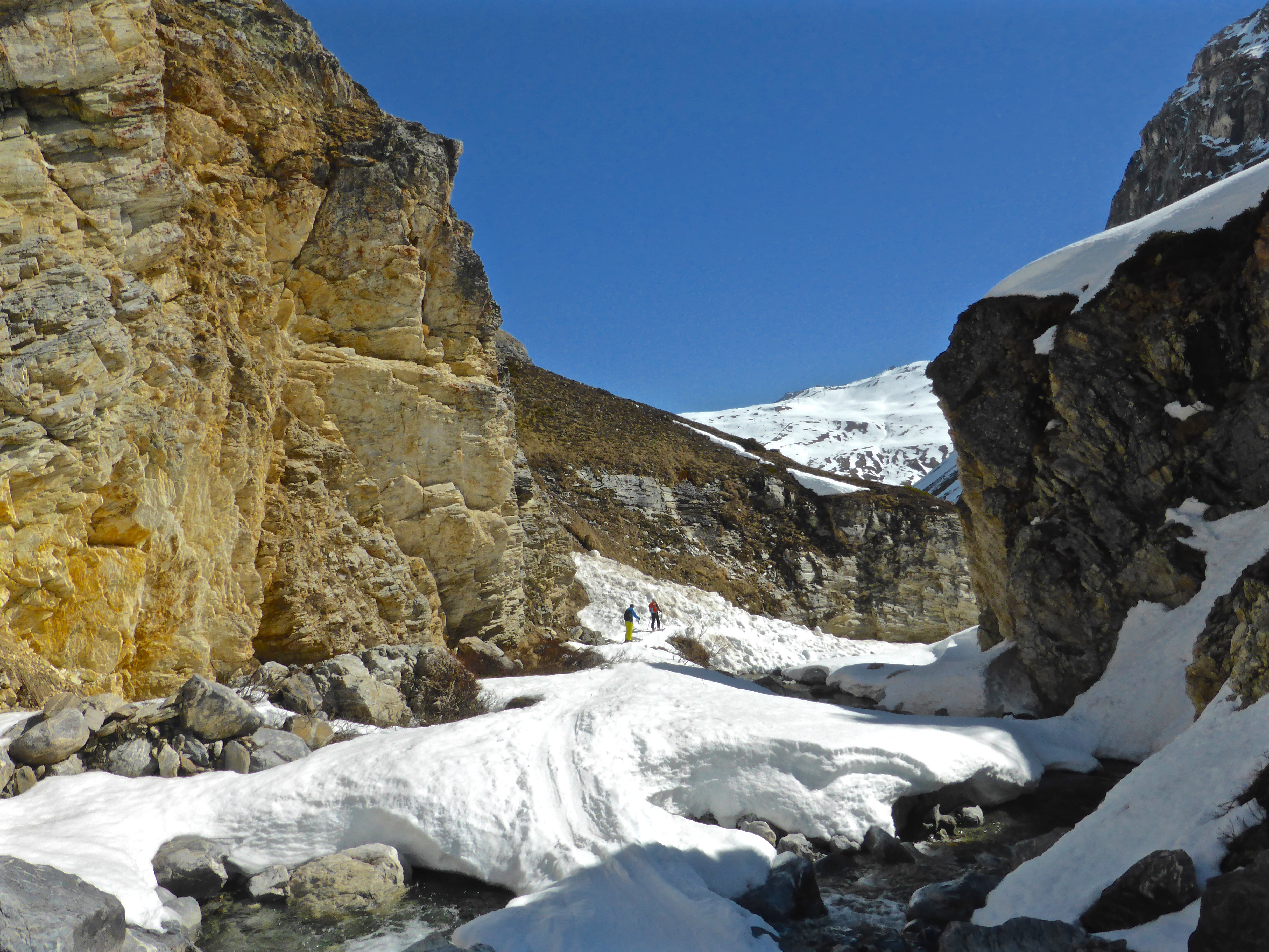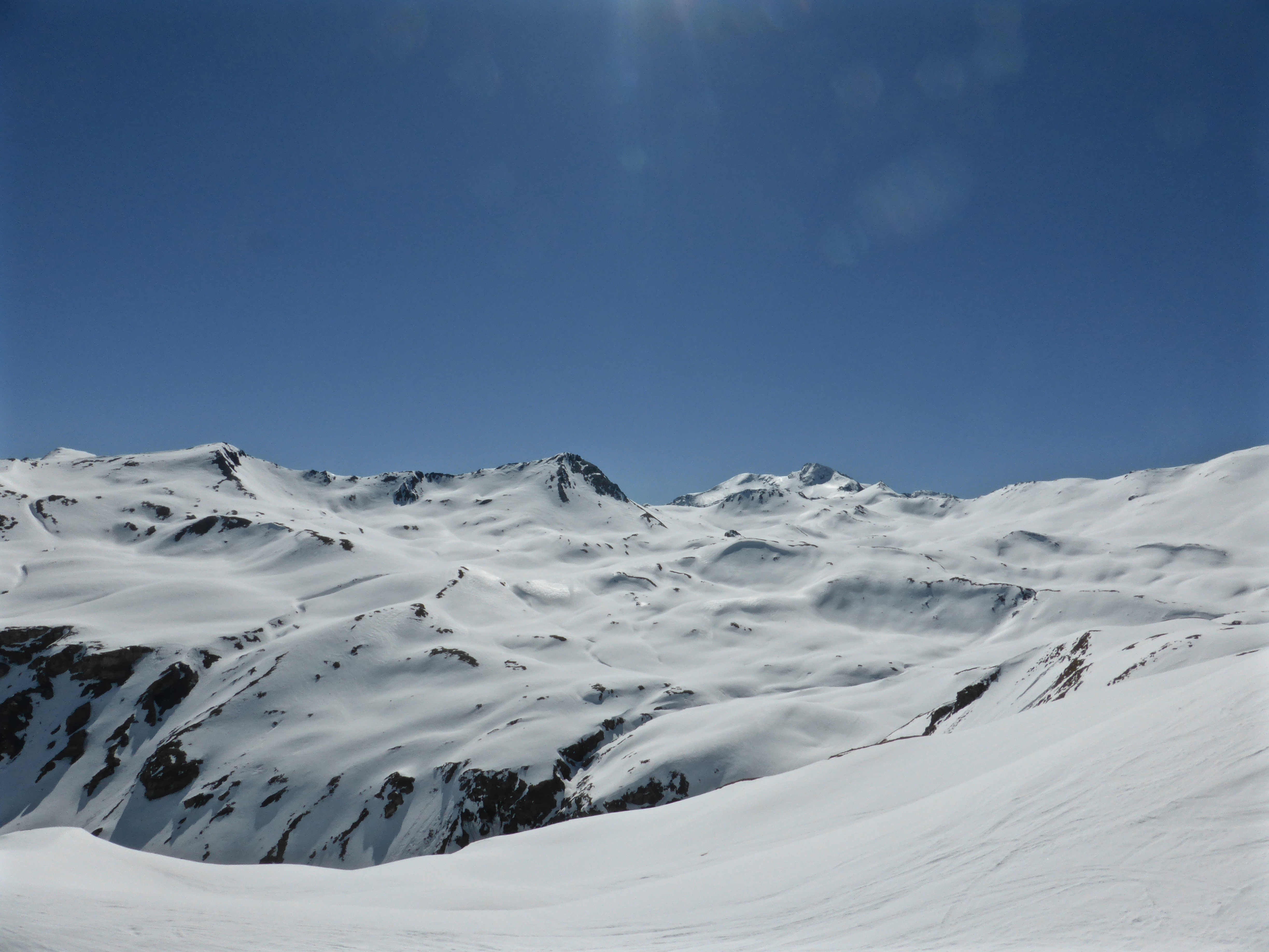 It’s not especially challenging: up on the Borsat side, then traverse towards the Pointe de la Sana, walk a bit, slight left, ski down, put skins on and hike up for about half an hour – but it has that tingling sense of adventure. The sun was shining throughout that day, as it has these past few days, triggering several sizeable slides on a number of faces. We clambered through some, skied around others. Having started on the first lift up, we got back in resort just before 11 — still time, then, to hop over to Le Fornet and have a run down the Vallonnets, last visited about this time last year.