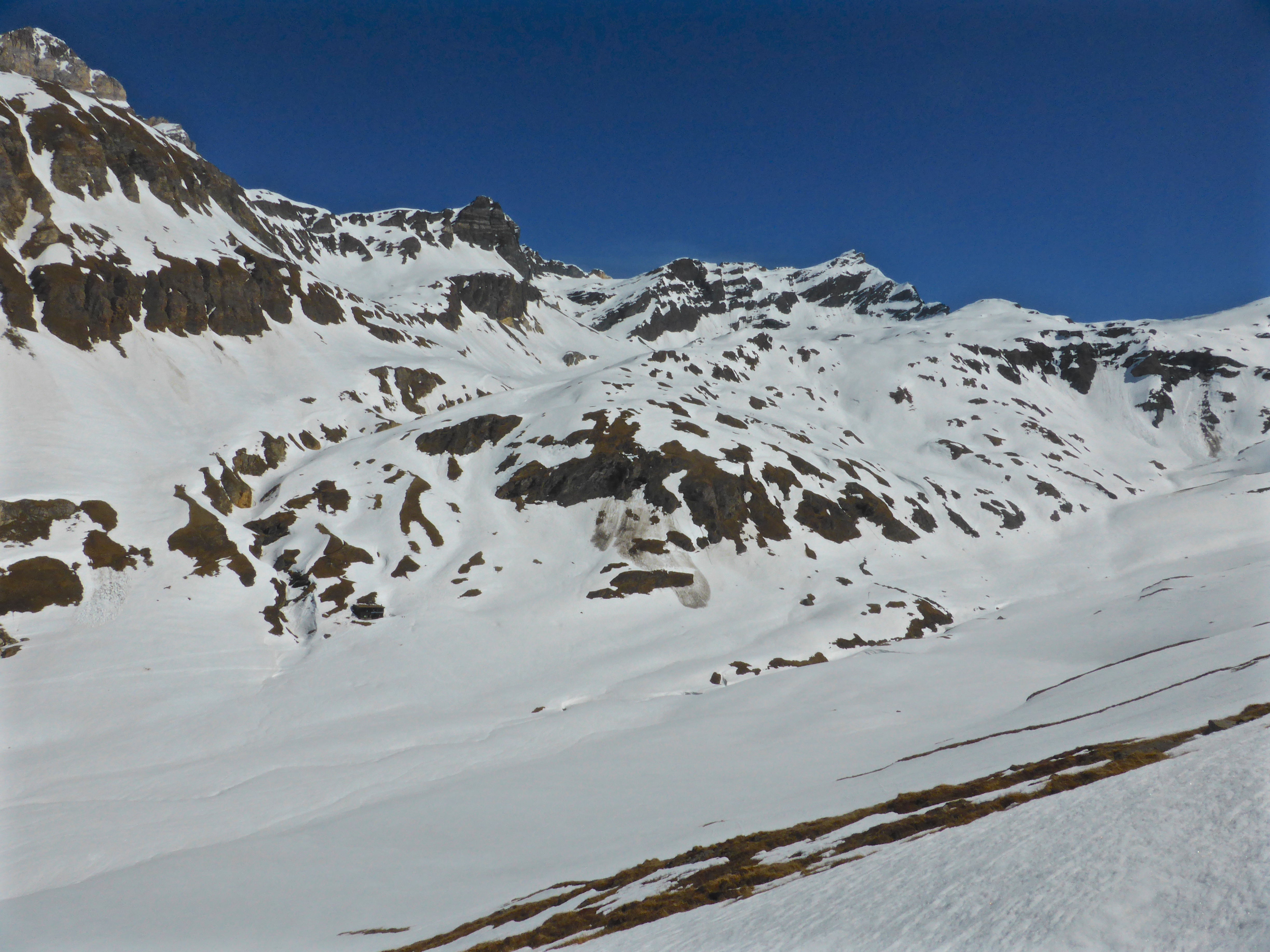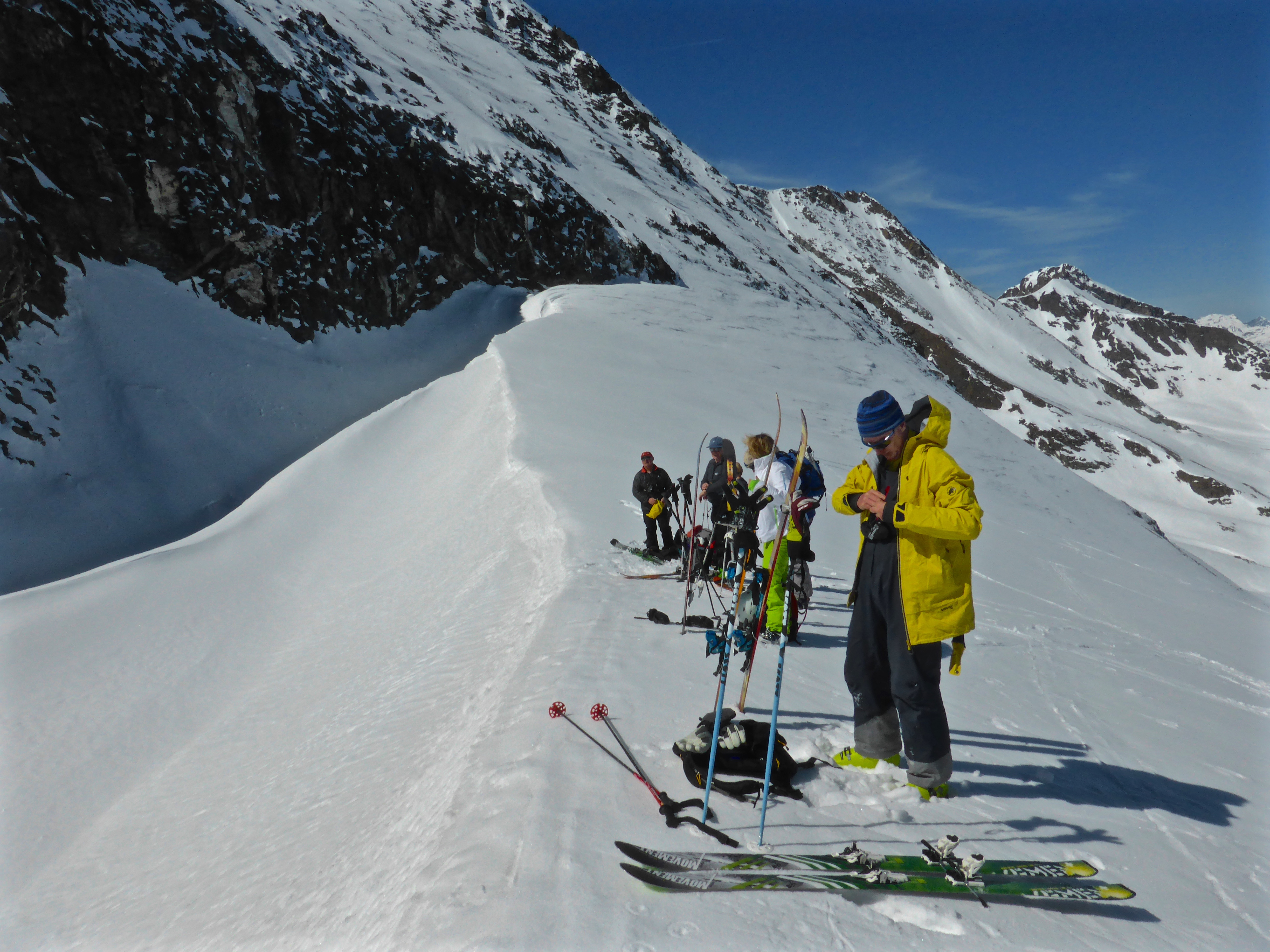 This morning however, the very steep approach to the final stretch of the climb was all rock and no snow; perhaps manageable but not worth the risk, even though guide Chris reckoned the snow on the other side would probably be very good. One group of skiers proceeded upwards and appeared to struggle; we didn’t hang around long enough to see if and how they finally made it.