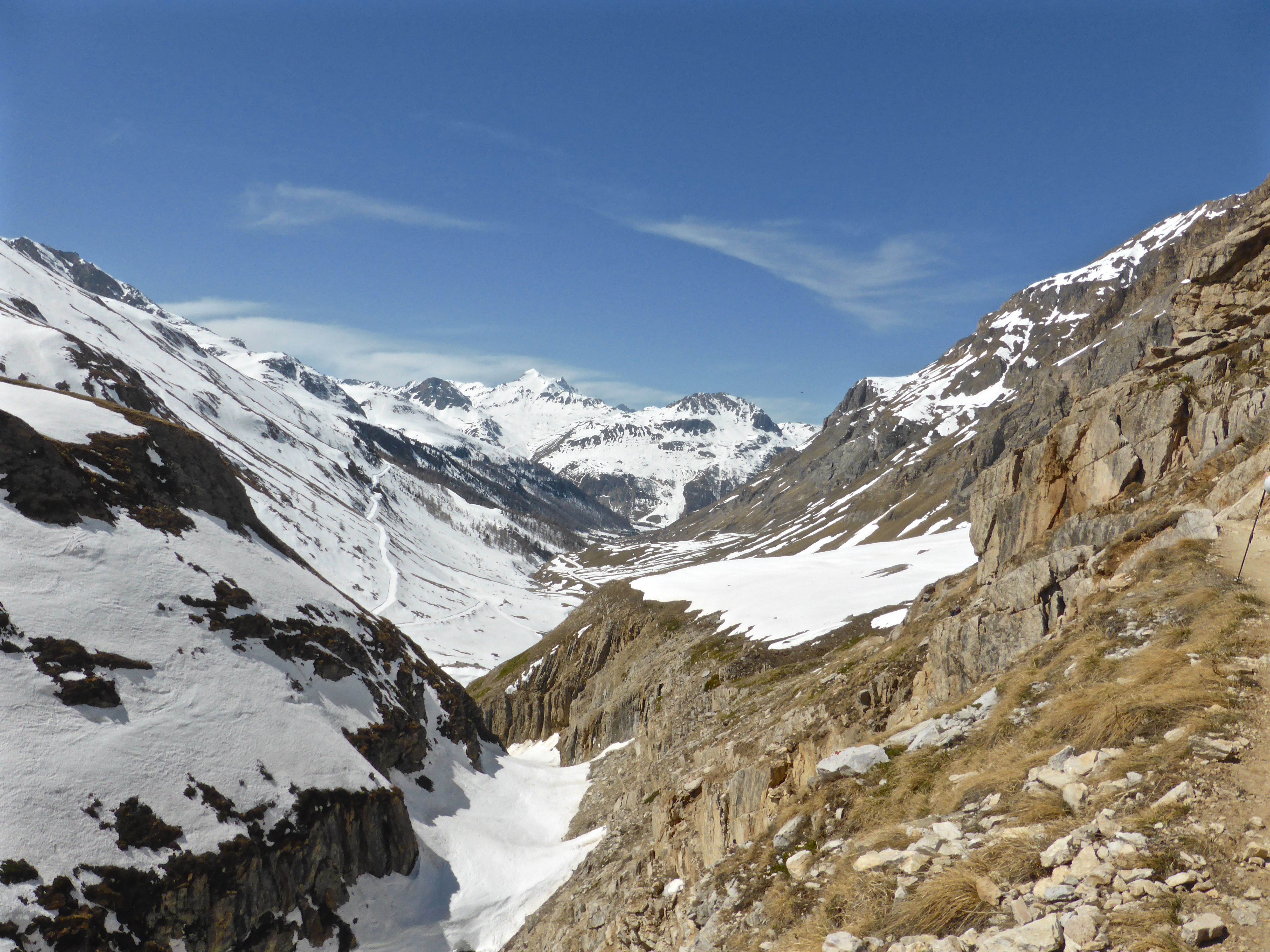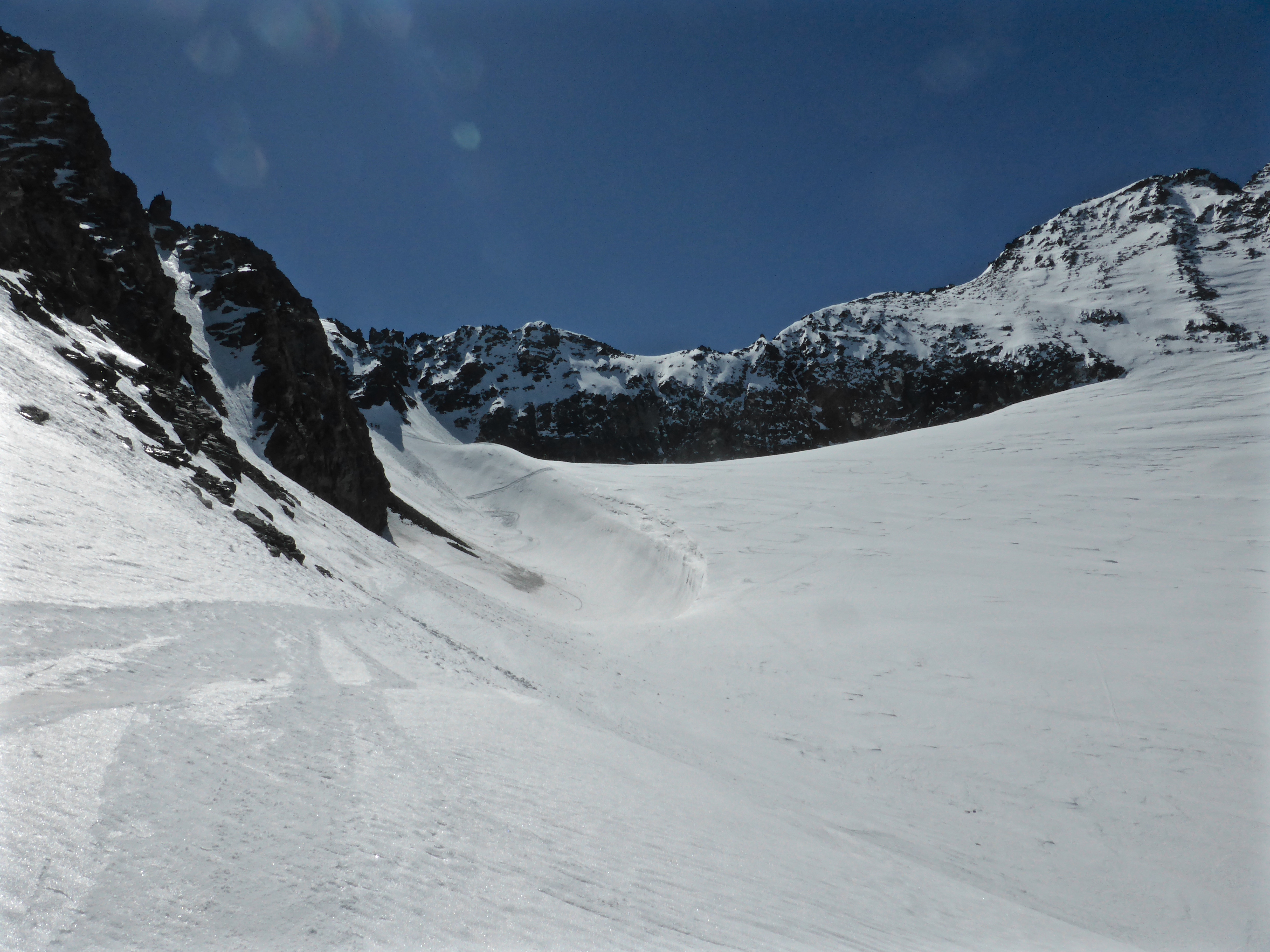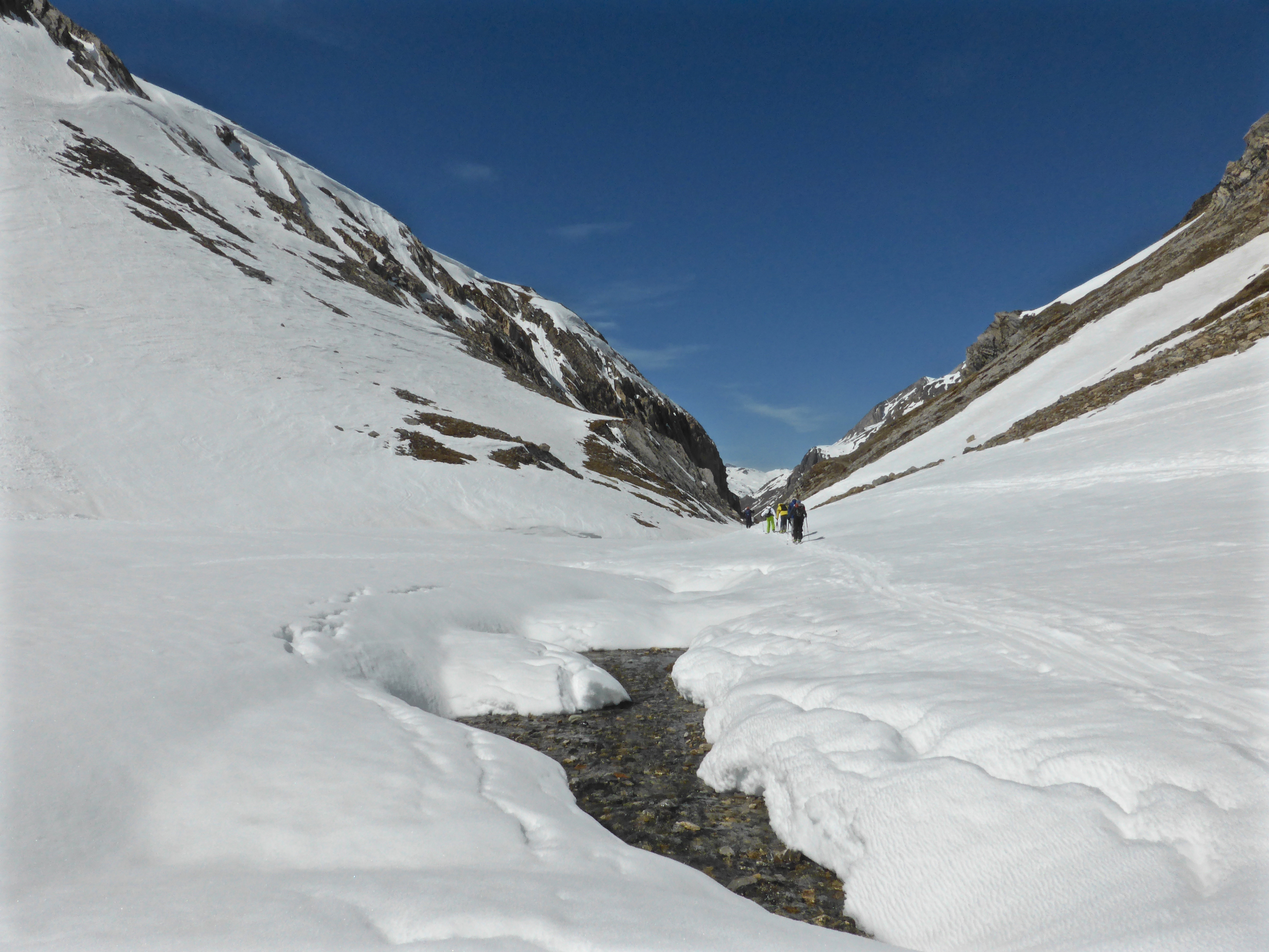 So we headed down the glacier, in a series of long clear runs towards the refuge du Prariond before walking back through the gorges de Malpasset on the summer path, which was mostly clear of snow.
