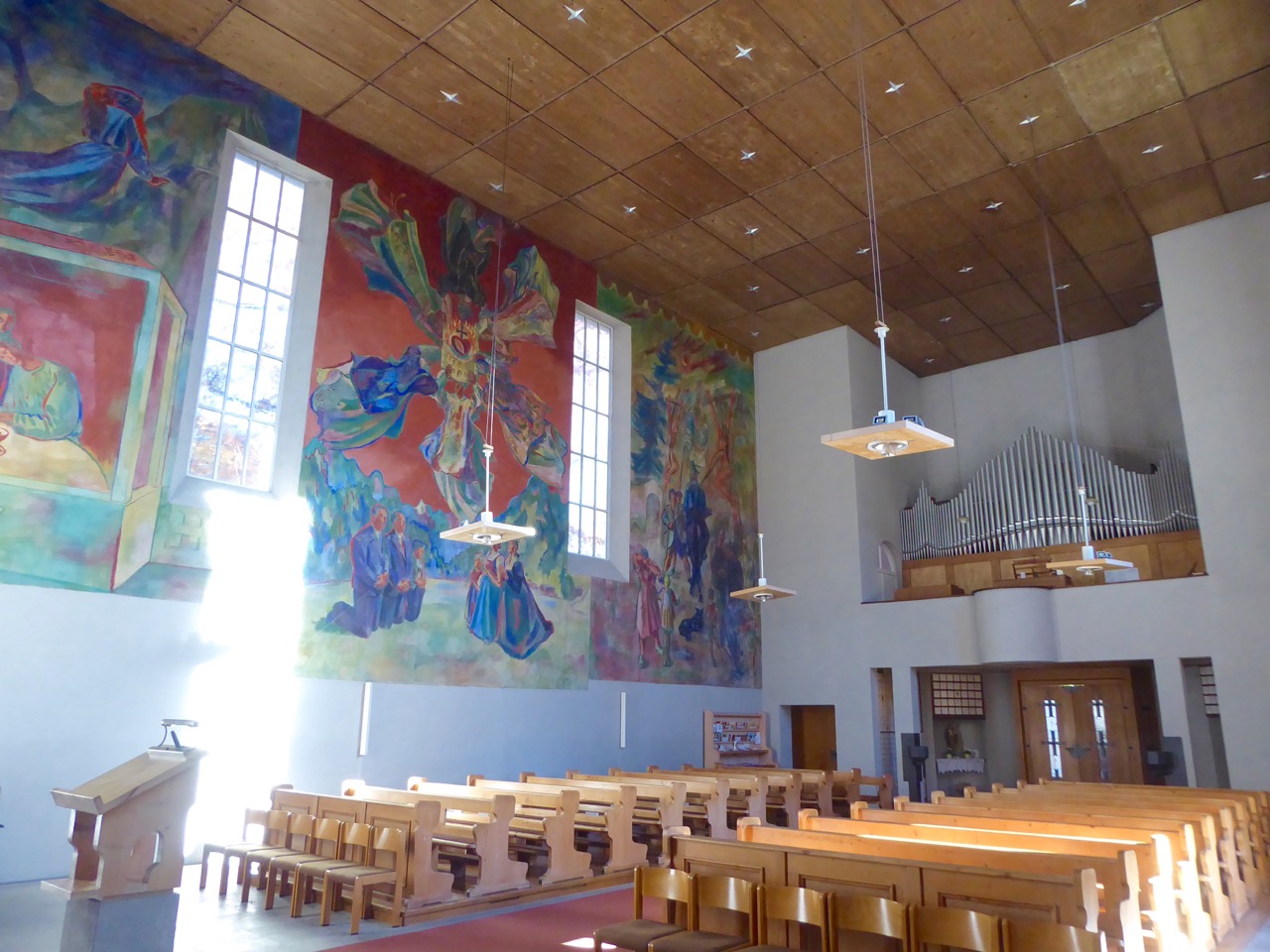 Innsbruck, October 2015 – The tiny balcony protruding on the west side of the Theresien Kirche, in Innsbruck’s Hungerburg suburb, is one of the few external ornaments on the austere 1930s church. Its shadow, already long at nearly 4pm, gives fleeting depth to the plain off-white wall. Inside, the afternoon sun glides over the simple benches and lights up the post-war frescoes painted by Austrian artist Max Weiler in 1945.