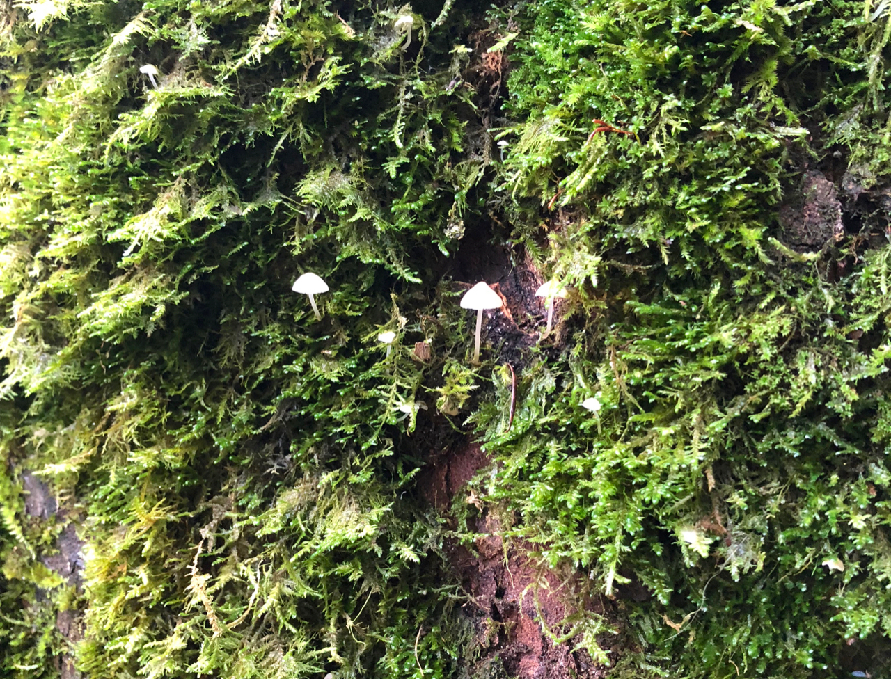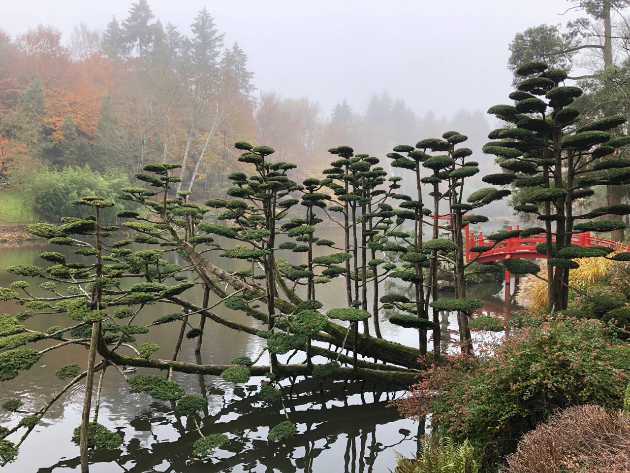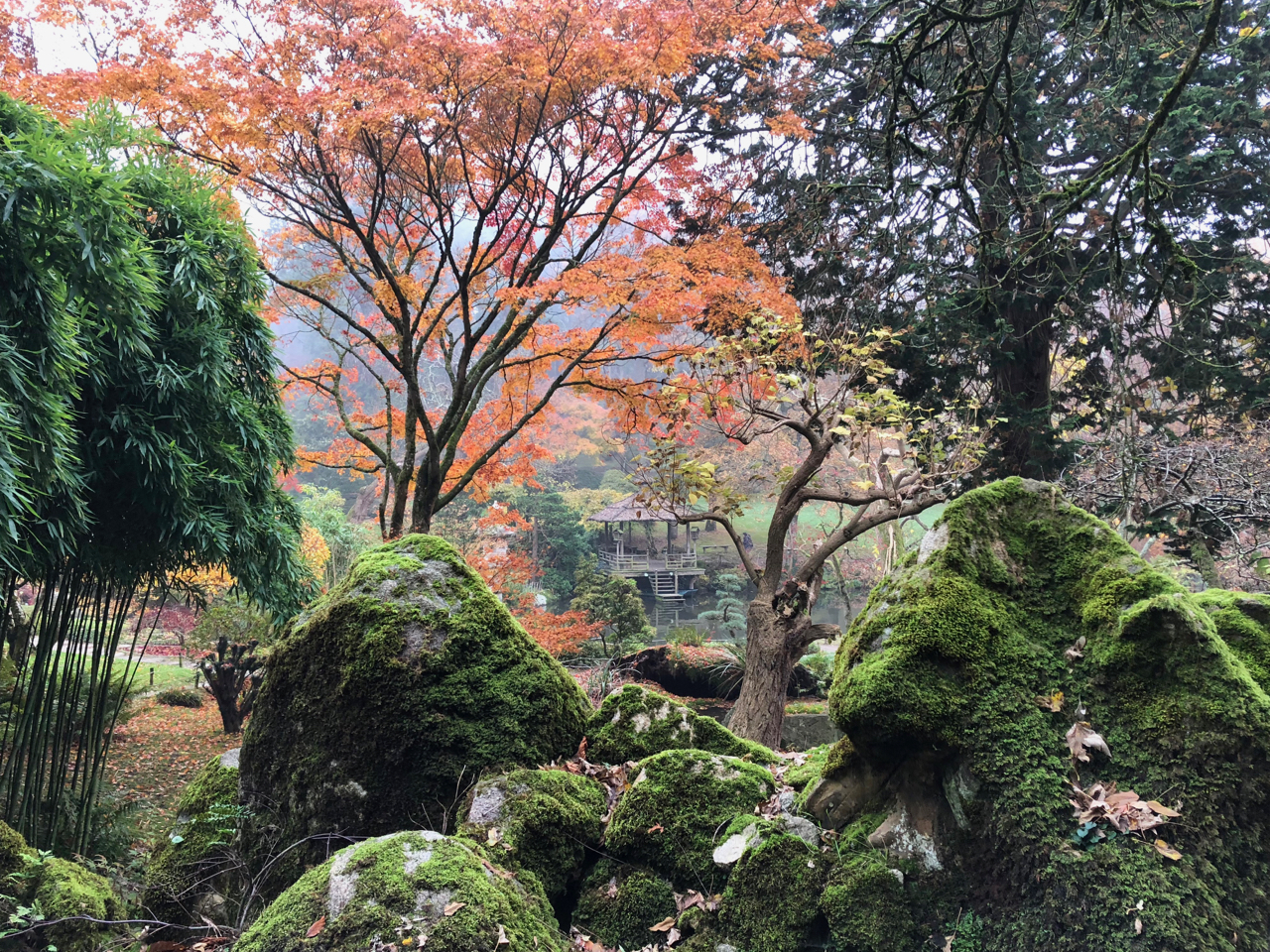 On the way out, we notice small white mushrooms growing out of the moss halfway up a tree trunk. Is this intentional too? Maybe it isn’t, but even in the dreich greyness of the day the Japanese garden has made us look at things differently.