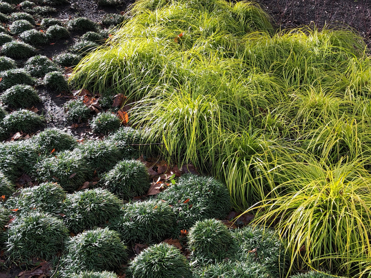 A bit further on the left, the soft green mop heads of ophiopogon contrast with the hairy lime-green tufts of carex Everillo, set against a curtain of maroon-red cornus alba Sibirica. “Look at us”, these attention seekers seem to say, “Look at our cool shapes and vibrant colours!”