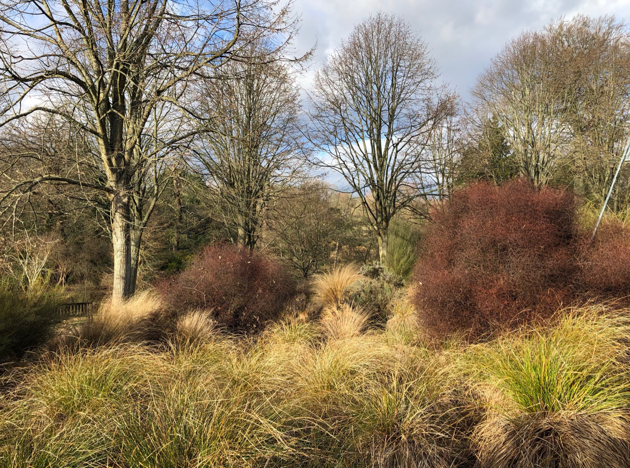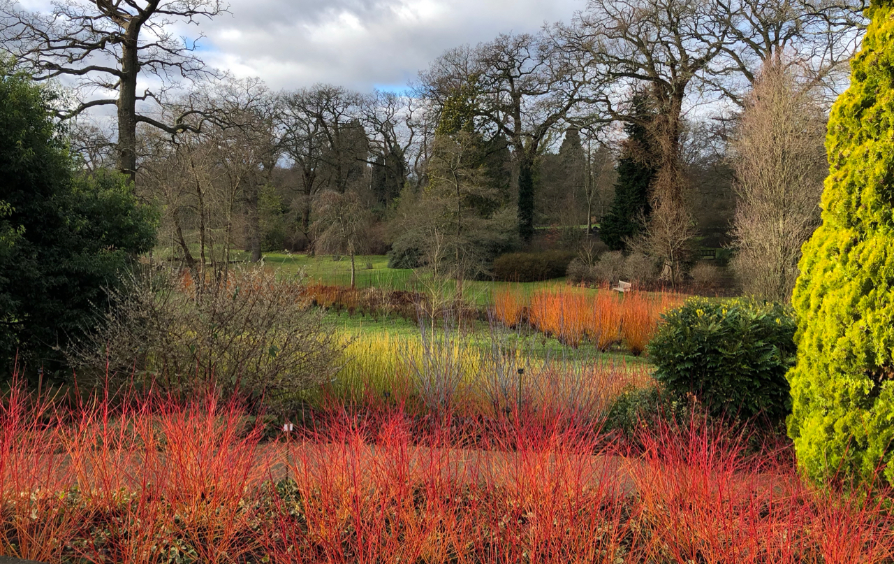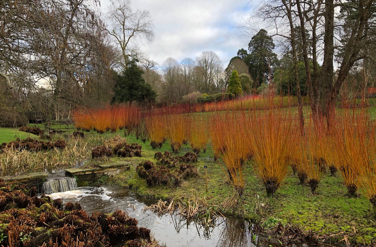 And there’s no ignoring the rows of pollarded willows, with their fiery orange and yellow stems lighting up the banks of the stream, or the masses of red and acid-green dogwoods.