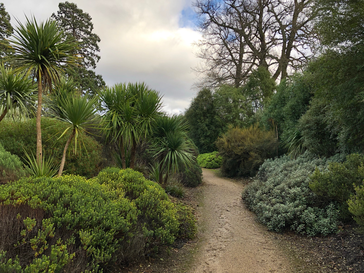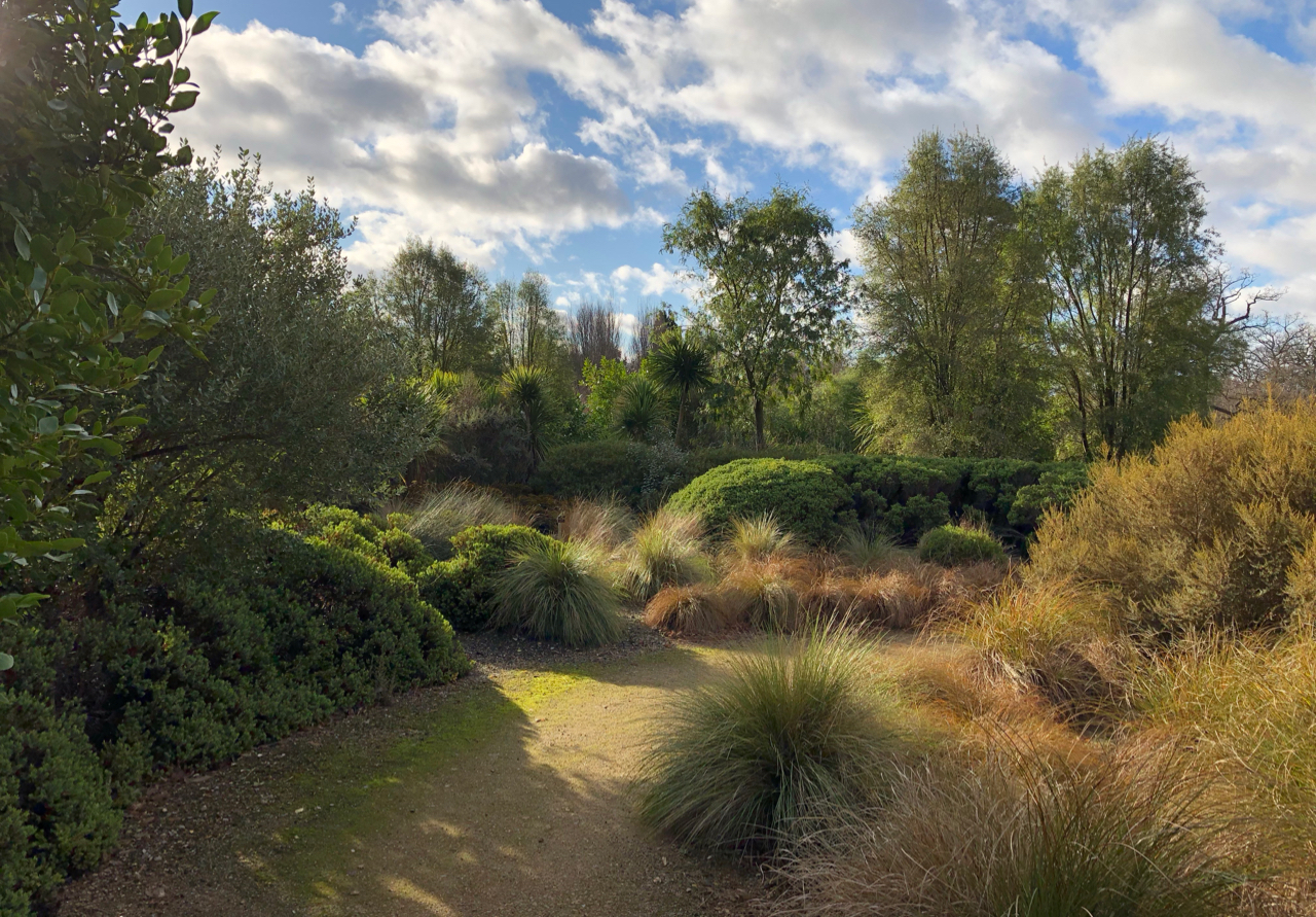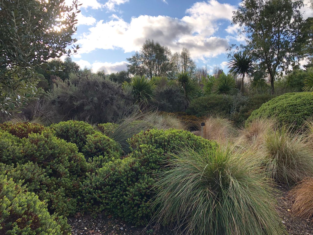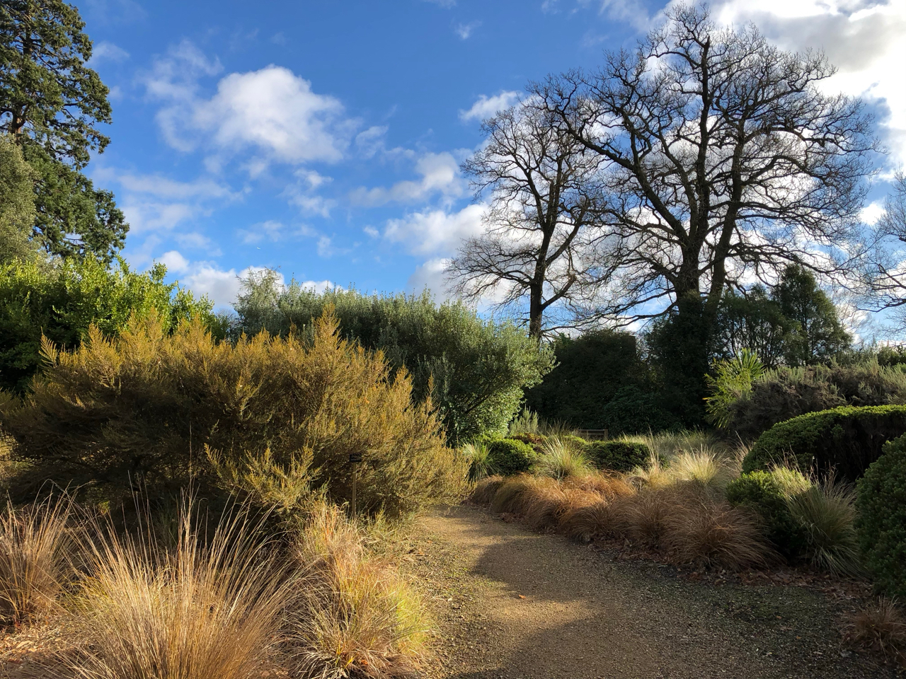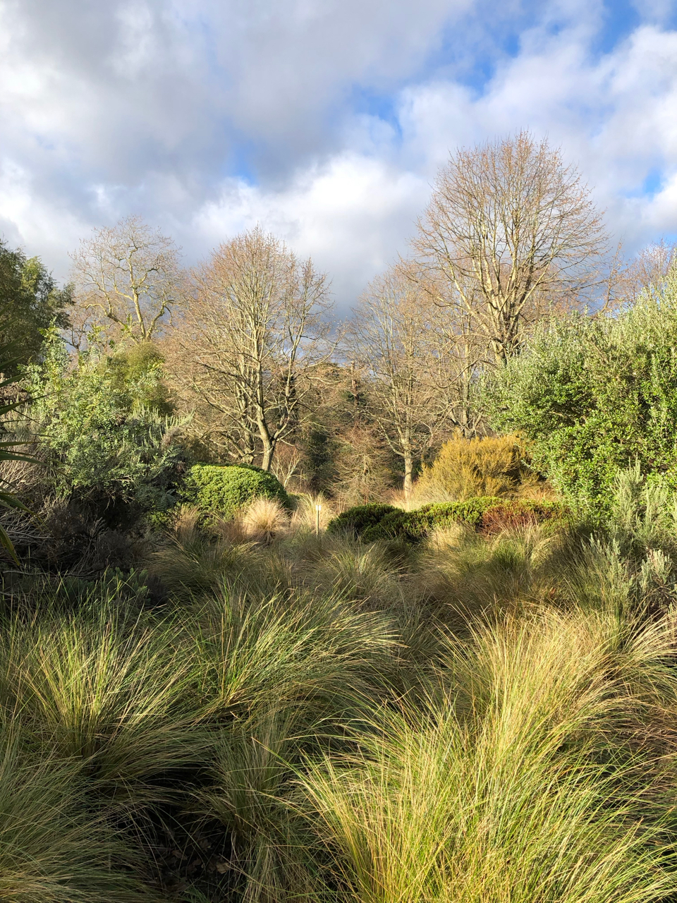 Back in the open on the sunny side we don’t have as much time to linger in the rather beautiful New Zealand garden. It’s not very large but it’s a very welcoming space, with a whole variety of shapes and textures, many of them unusual in English gardens. Combined with a limited colour palette of greens, browns, bronze and golds, it’s also a lesson in resilience and adaptability. If the winter trail is inviting us to think about winter differently, then the New Zealand garden is a nudge, in the context of climate change, to start adjusting our garden aesthetics to embrace more actively some of those hardy and drought tolerant plants.