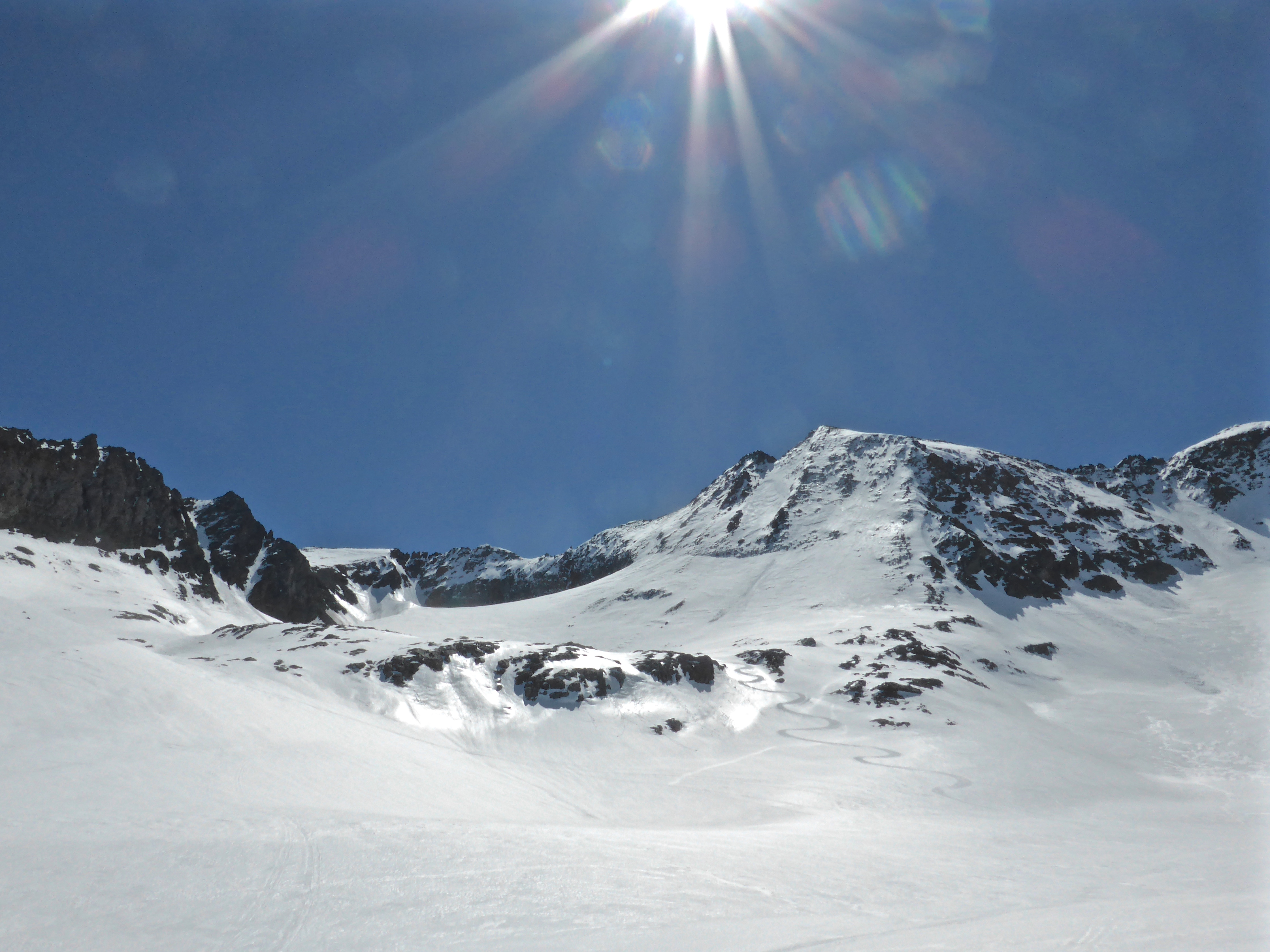 Yesterday’s miles of skinning are already a distant memory. Today, we’re skiing; just skiing. After a less than auspicious start –  from the top of Bellevarde down the Super-Santons on yet-untransformed snow and amid brown grassy patches – we headed back up the hill, then through the jardins de Borsat, across to the Charvet and down a depleted but good couloir du Mont Blanc. Once again, with snow being in limited supply, guide Chris ushered us about the mountain in an attempt to avoid crowds, and mostly, as usual, he succeeded .